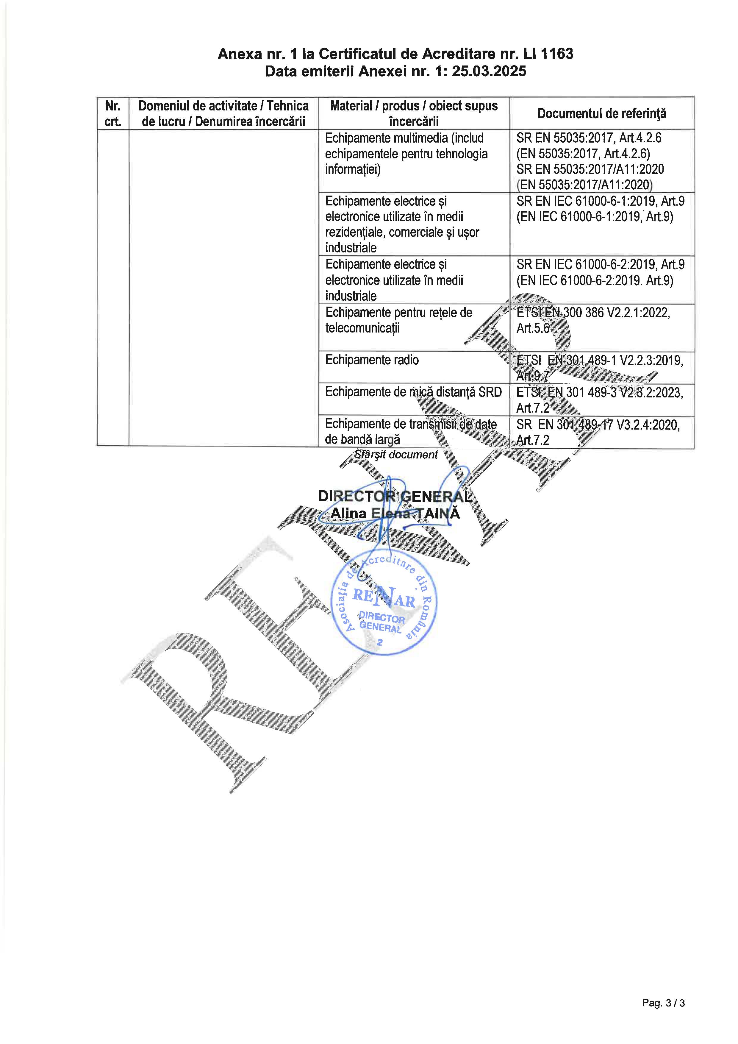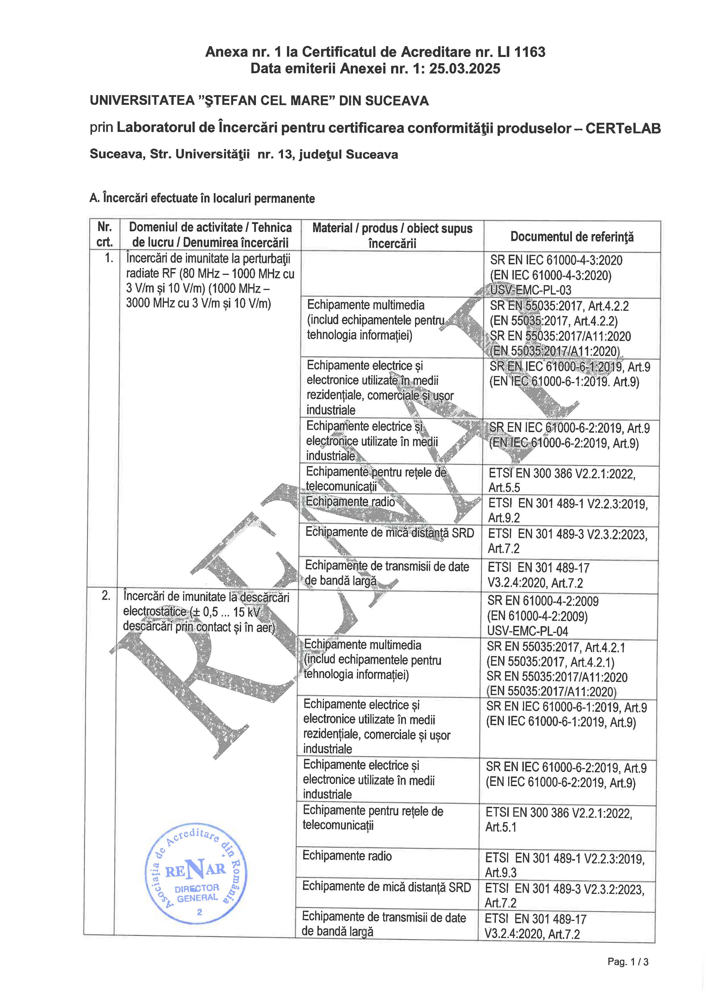 CERTeLab - Laboratorul de încercări pentru certificarea conformităţii produselor Acreditat RENAR conform standardului SR EN ISO/CEI 17025:2018 Certificatul de acreditare nr. LI 1163, emis sub sigla ILAC-MRA, este valabil între 05.03.2022 şi 04.03.2030. Acreditarea iniţială a avut loc pe data de 22.07.2009. Descărcaţi Anexa la certificatul de acreditare. |